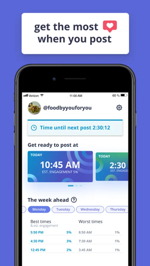 Get more Instagram followers and engagement by posting at the best times with this easy social media management app.