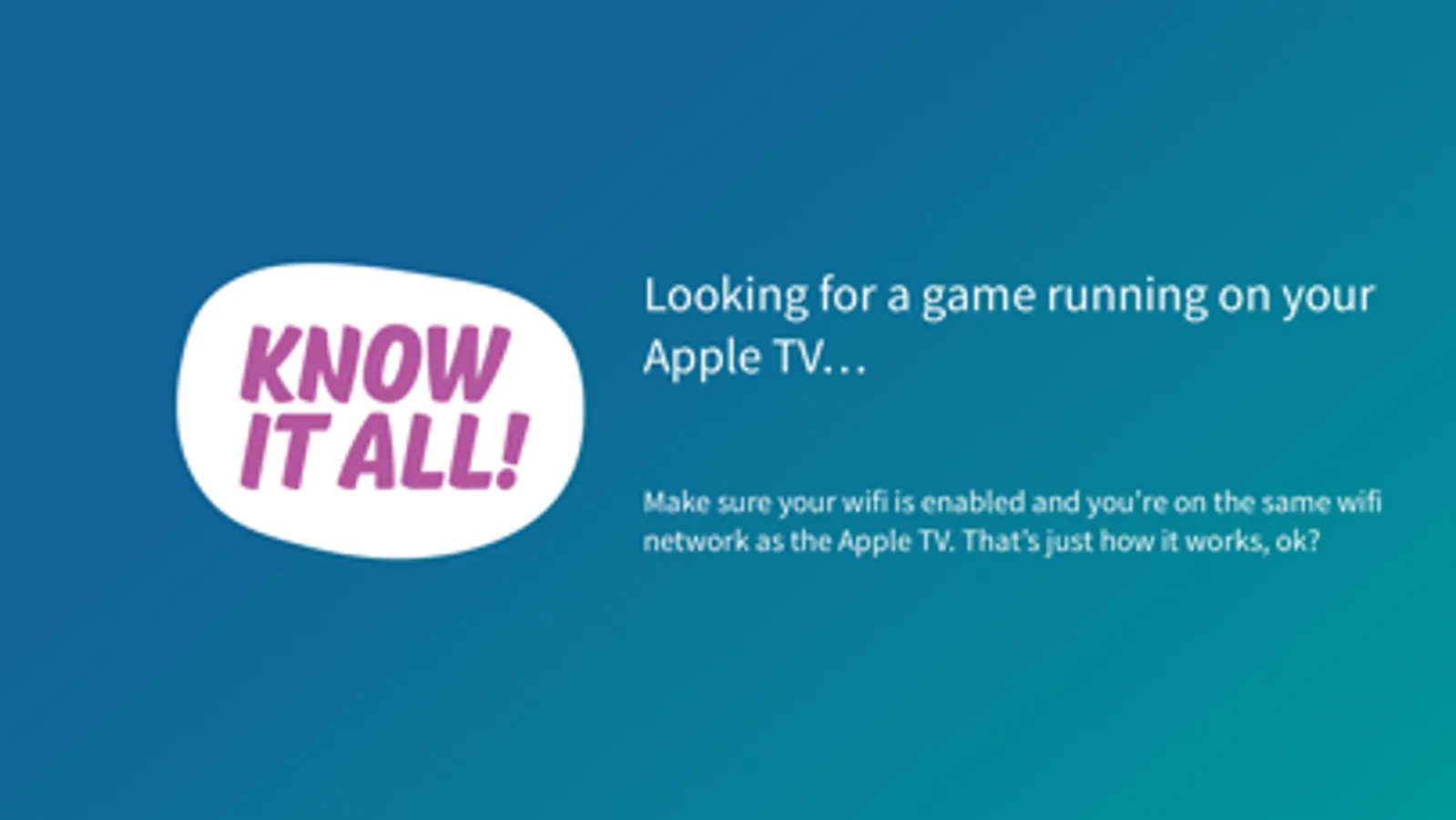 This app is used as a buzzer in the Know It All: Trivia Party Game Apple TV app. Download the Apple TV app by searching for "Know It All" in the App Store on your Apple TV!