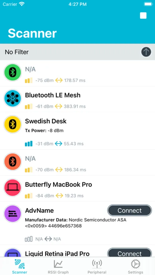 • Filter Scanned Peripherals by Name, Manufacturer, Services (Advertised & Connected) and RSSI Level.