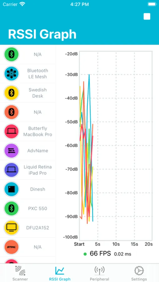 • Live RSSI Chart of Scanned Bluetooth LE Peripherals.