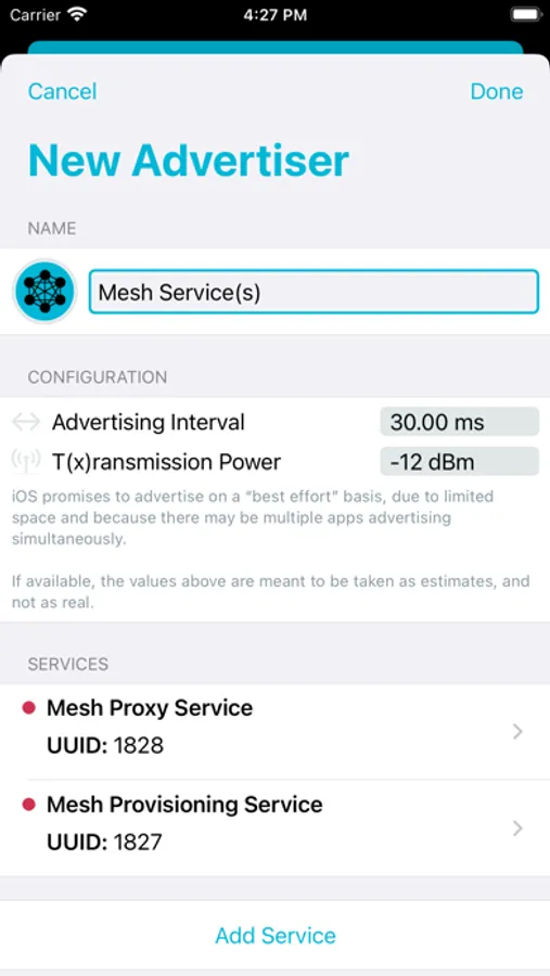 nRF Connect also allows your iOS device to advertise as a peripheral, with full support of many of Bluetooth SIG adopted profiles.