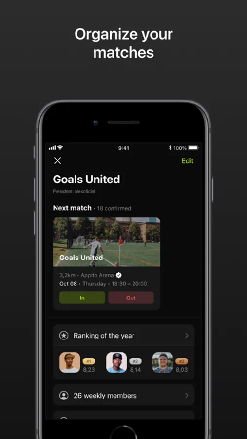 - You can organize your matches, either by creating a group or a one-off game with other players.