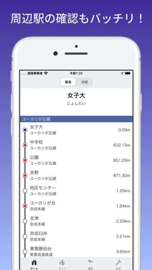 ・周辺駅リストを押すとその駅をマップで表示します。長押しでその駅を起点とした周辺駅を調べることができます。ピンマークをタップすると解除できます。