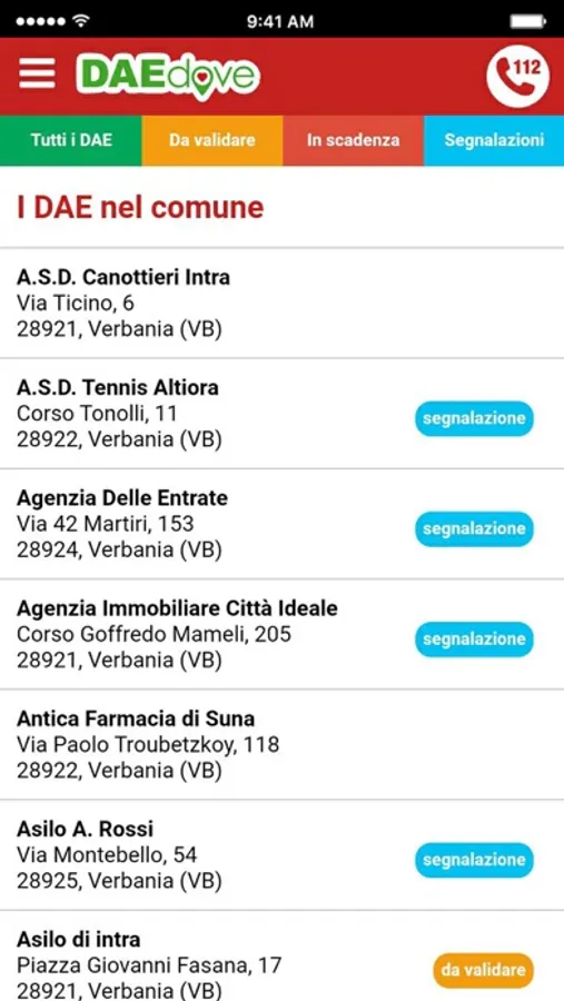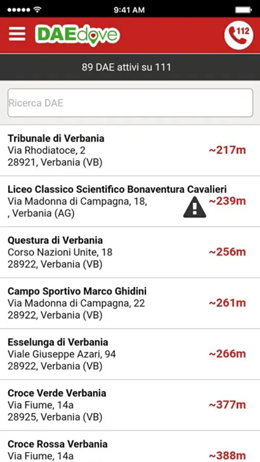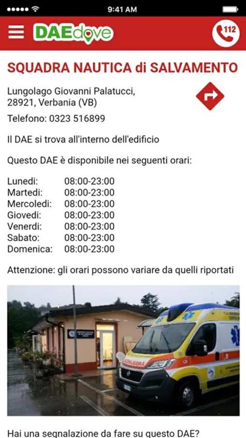 - Informazioni complete (indirizzo, recapito telefonico, scadenze e orari di disponibilità del DAE)