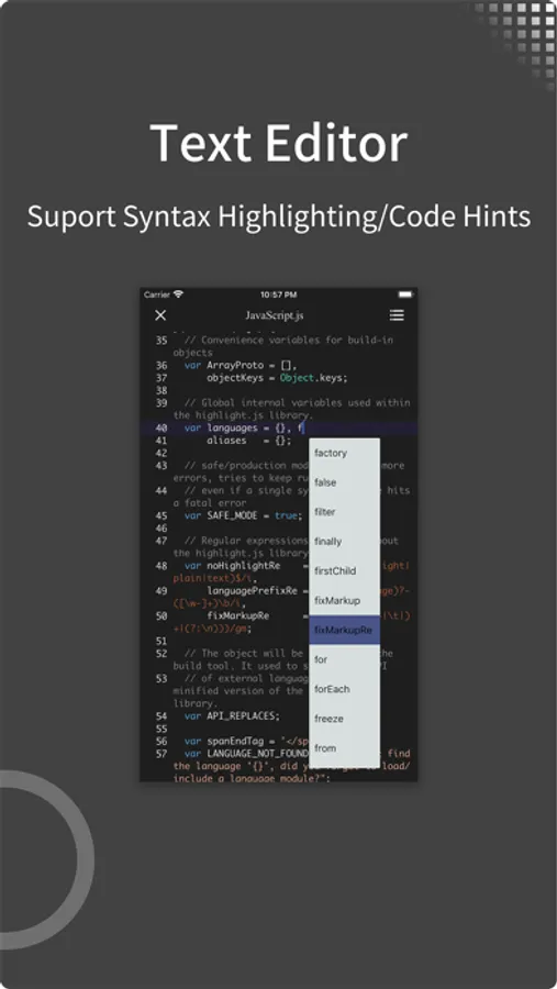 * Support editing format : Json, HTML,XML, C/C++, Lua, Java, Objective-C, Swift, Python, JavaScript.
