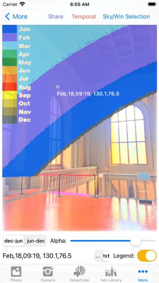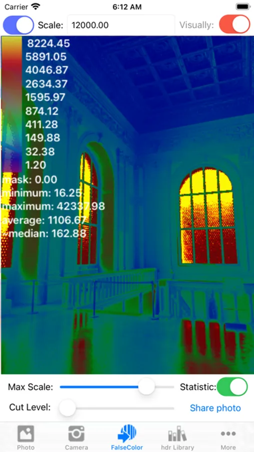 Therefore, by using this app and then measuring luminance values of each pixel, minimum, maximum, mean, and average values of any area in the scene, or by creating falsecolor images with different scales and color palettes we can evaluate quantity or even quality of light conditions in a realistic space.