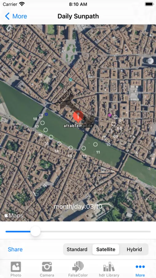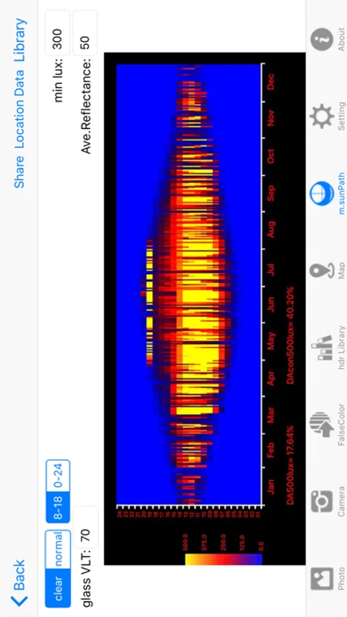 Moreover with the help of the GPS navigation unit and motion sensor, this app can create a sun-path diagram and measure total sunlight hours, and estimate Daylight Autonomy, Continuous Daylight Autonomy and also Daylight Factor for each specific camera point and view direction in the space.