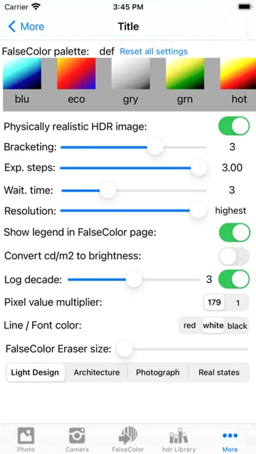 Regarding the lighting designer needs, the main function of this iPhone application is to create physically based HDR images in which each pixel corresponds to a realistic luminance value. To get more reliable values, there is a very simple way to calibrate the camera.