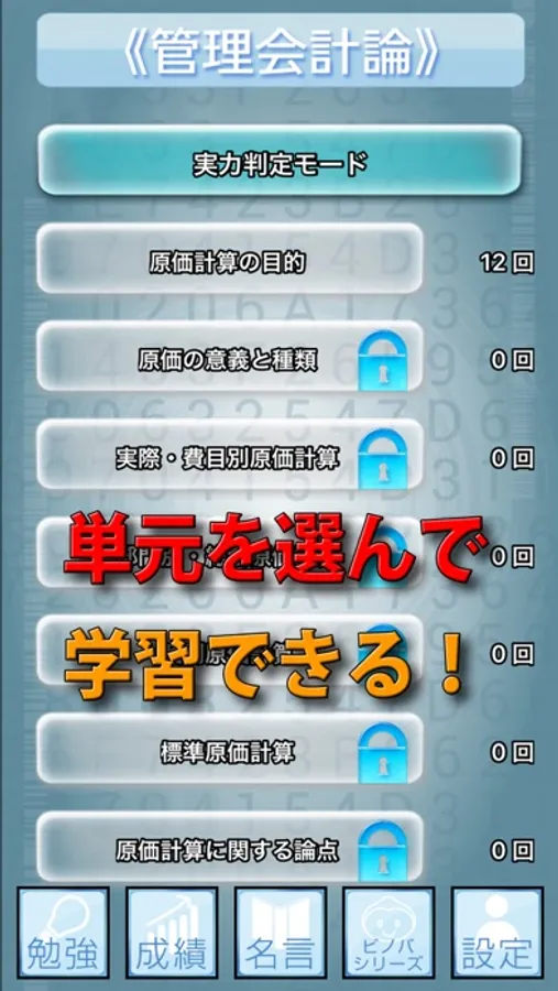 管理会計論の主な単元から、圧倒的なボリュームの約500問。しかも自分の苦手な単元だけを選択して勉強可能です。