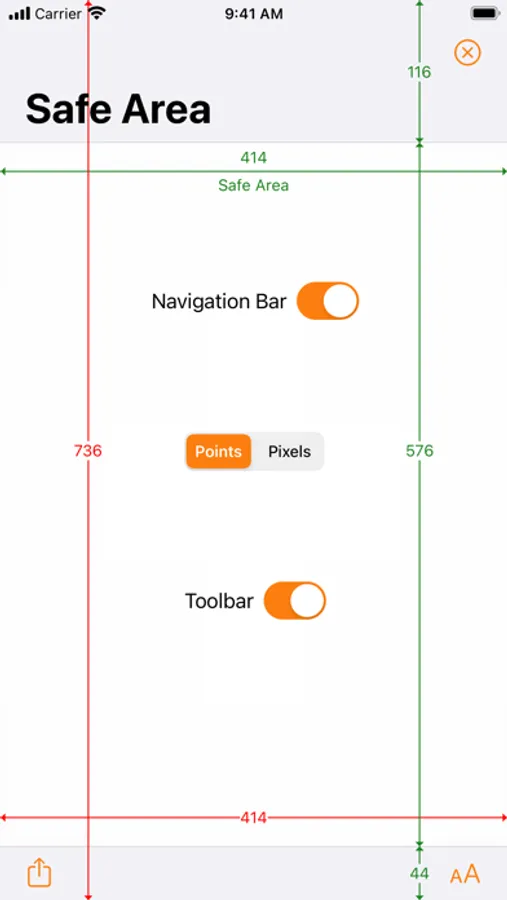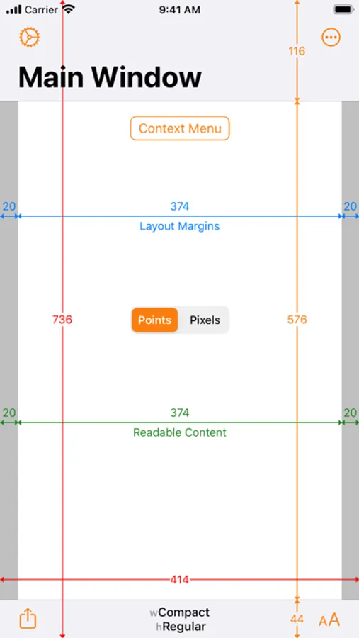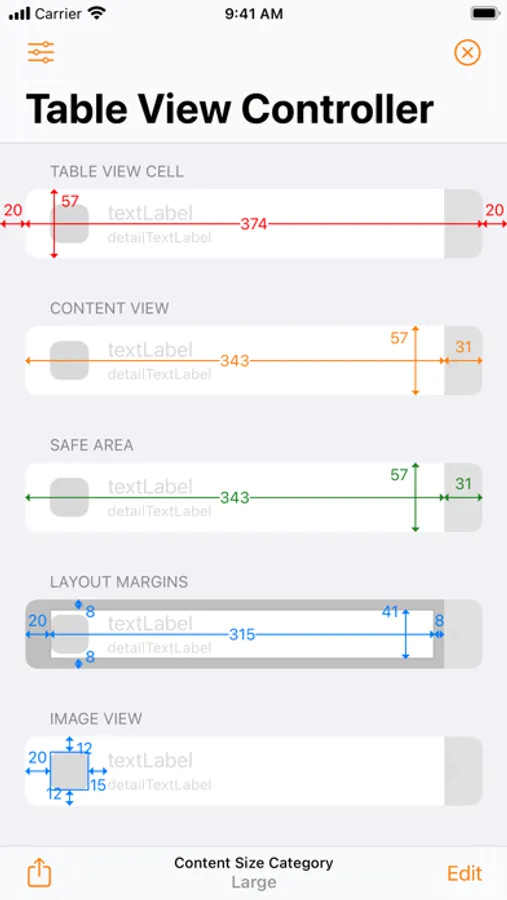 • Visualize sizes for full view, layout margins, readable content guide and safe area layout guide.
