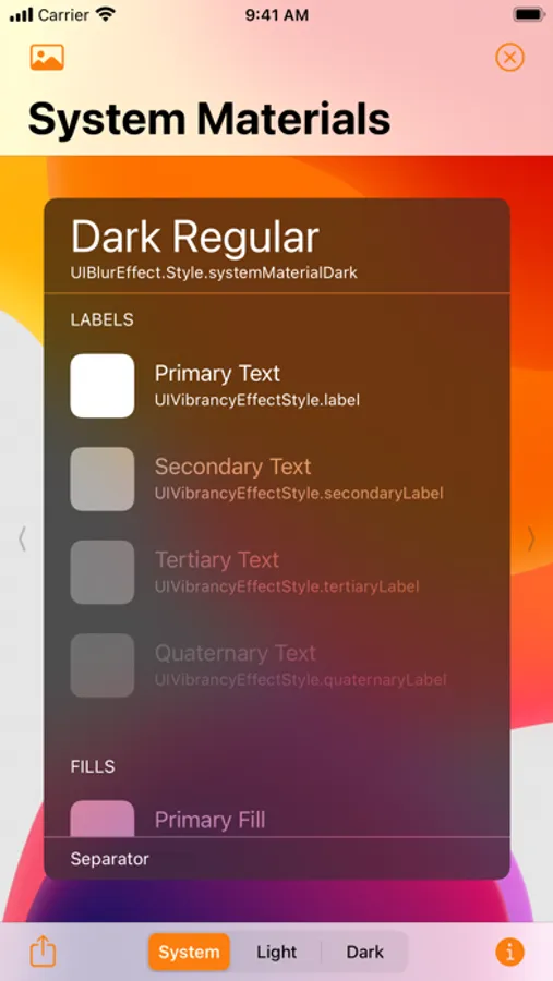 • Explore System Materials (requires iOS/iPadOS 13 or later).
