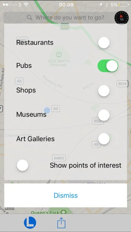 Types include: 1. restaurants, 2. pubs, 3. shops, 4. museums and 5. art galleries. After selection, confirm and go back to the map.