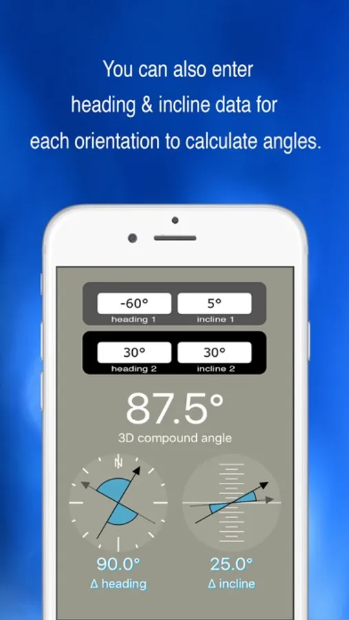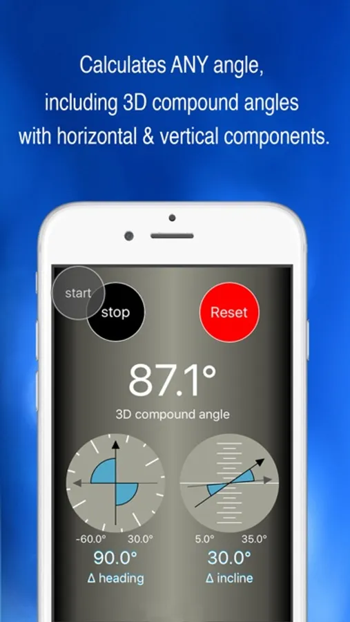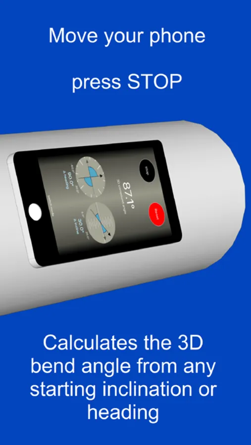 Position phone, press START, move your phone, then press STOP. Pipeline Angle Finder measures changes in phone orientation as your phone moves. Pipeline Angle Finder also calculates both the vertical and horizontal components of the compound angle - so you can see changes in heading and grade immediately.