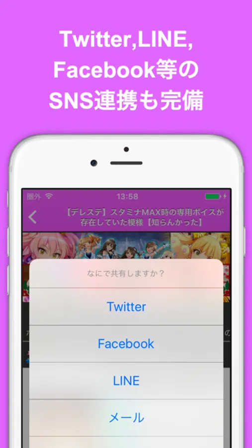 Twitter, Facebook, LINE等のソーシャル連携も万全!どんどんシェアしよう!