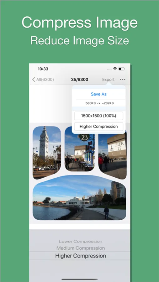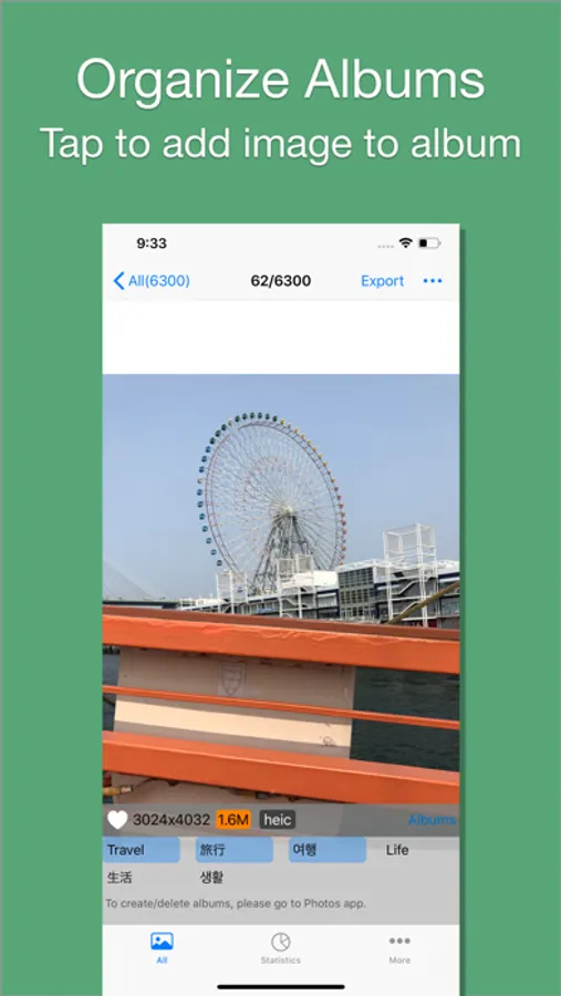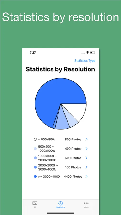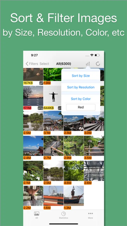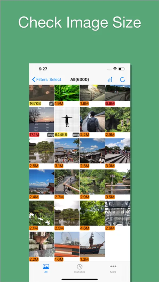 - Browse all images and see the size of each image just below the thumbnail. Different colors indicate different sizes, for example: images larger than 5M are marked in red.