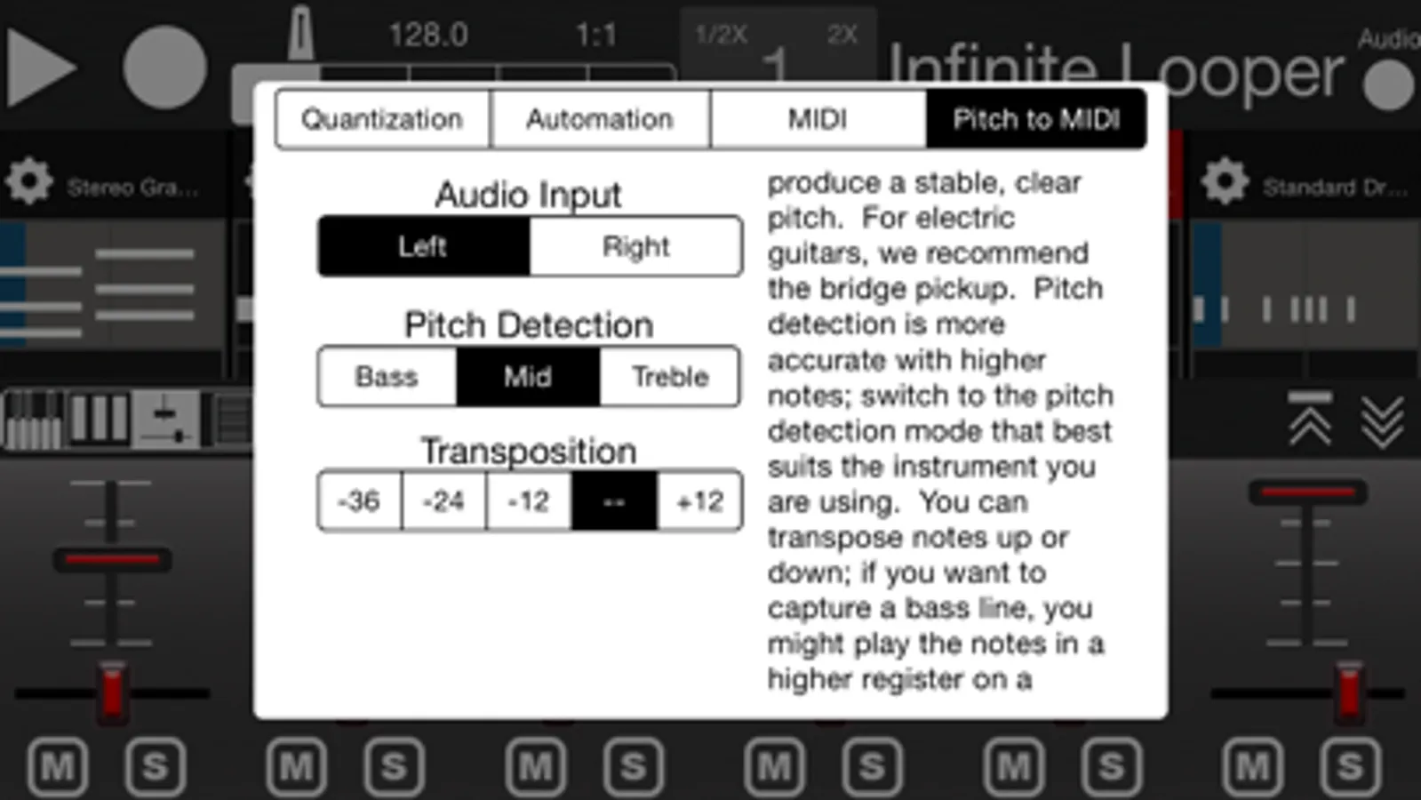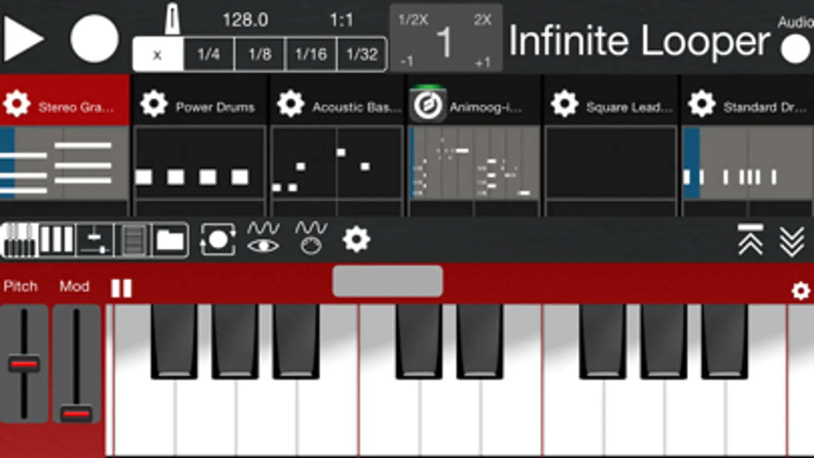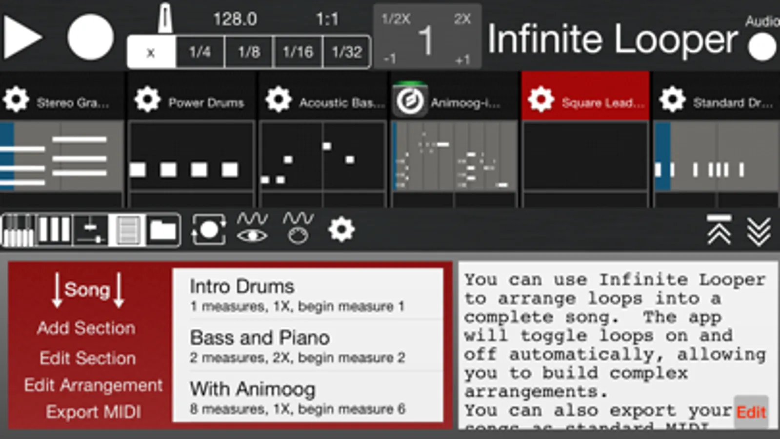 There are dozens of audio looping apps; Infinite Looper expands on this idea, allowing you to quickly select different synthesizers, and loop the MIDI to each with perfect synchronization. Each of the instruments can have up to eight simultaneous loops. The loops can be of different lengths, up to sixtyfour measures long.
