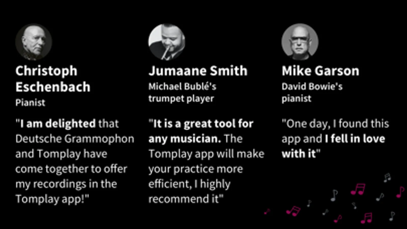 Tomplay is an application developed in partnership with the classical music label Deutsche Grammophon and trusted by more than 1,000,000 musicians in 157 countries.