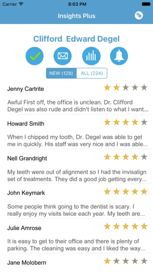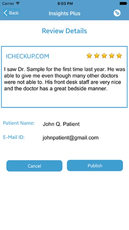 Doctors and their staff may download the iCheckup Insights App to their iPhone, iPad, or iPod to enhance interaction with their patients. Insights enables doctors to request feedback from their patients via a text message or email request. There is nothing for patients to download or install, and patients may use any type of device to enter their input. Doctors may view graphical reports about how their staff is performing, monitor procedure outcomes, receive benchmarking reports, and even compare their results with their peers.