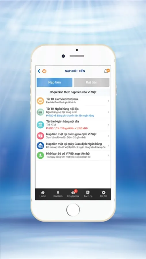 - Nạp tiền vào Ví dễ dàng, nhanh chóng qua nhiều hình thức: từ thẻ Ngân hàng nội địa, chuyển khoản từ tài khoản ngân hàng nội địa sang Ví, nạp tiền mặt tại Điểm giao dịch Ví Việt và nhờ bạn bè có Ví Việt nạp tiền hộ.