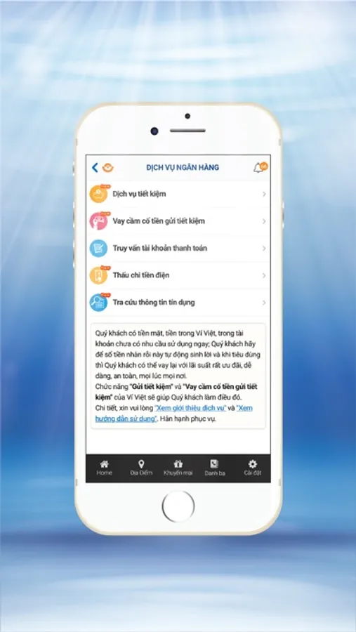 - Bạn có thể gửi tiết kiệm online và tất toán bất cứ lúc nào, vay tiêu dùng trực tuyến với lãi suất ưu đãi, truy vấn/sao kê tài khoản ngân hàng trên Ví Việt.