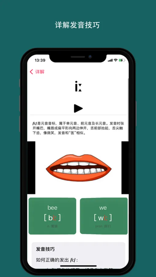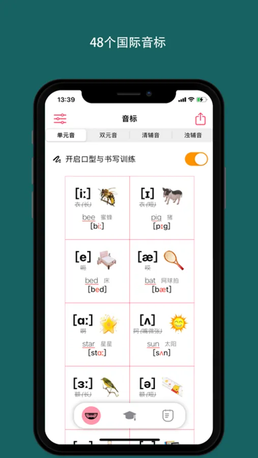汇集单元音双元音、清辅音浊辅音,标准的口型指导,界面简洁,操作简单。