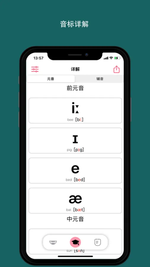 音标助手采用IPA88版本国际音标,真人录制,标准发音。