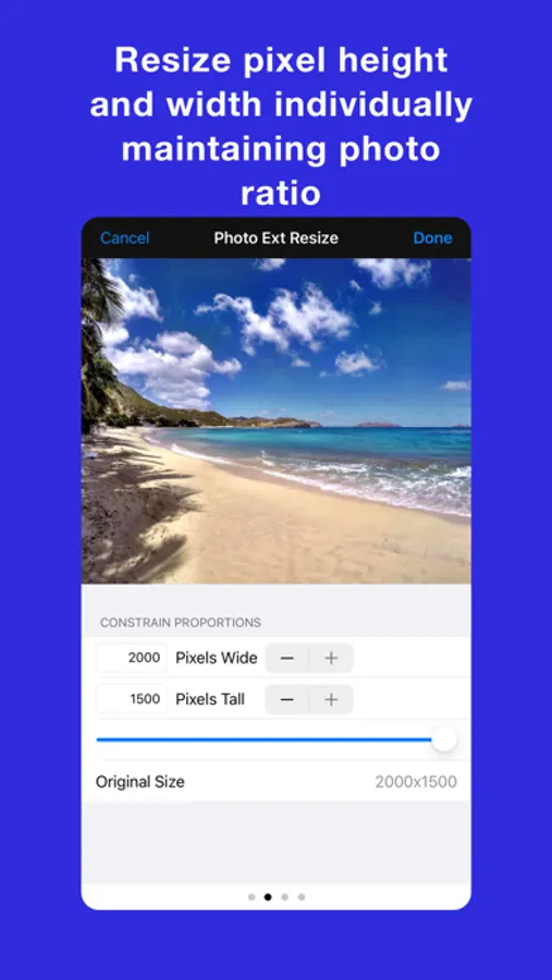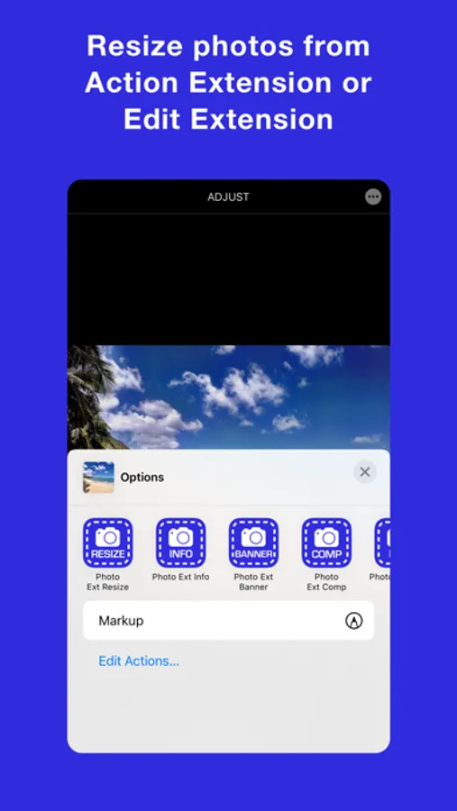 Photo Extension Resize resizes photos stored in the Apple Photos app for iPhone and iPad. This extension is great for photographers who need precise resizing control over photos. The extension offers several types of resize options including percentage resize, constrained proportions, custom resize, and industry-standard preset sizes. The extension always makes a copy of the original, so the original is kept intact.
