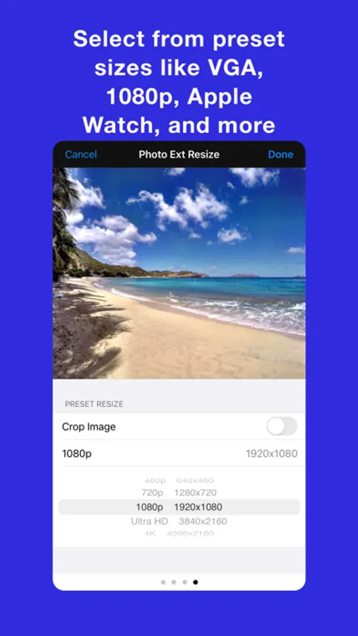 + Resizes photo to preset sizes like VGA, 1080p, iPhone, iPad, and more.