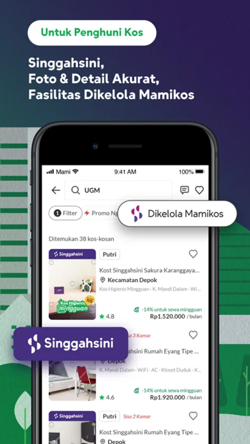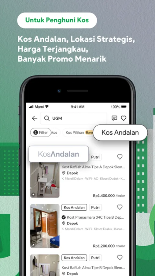 Mamikos is an all-around app for millions of tenants and property owners (Mitra Mamikos). Through Mamikos, finding, booking, and paying rent are easy, safe, and convenient. All kos, apartments, and houses in Mamikos can be rented anytime, anywhere. You can book and pay for your kos directly through our integrated payment system with multiple payment methods. Enjoy numerous attractive promos to help you pay less and get MamiPoin in the form of cashback every time you rent and pay via Mamikos. The cashback can be used as a discount for your next bill.