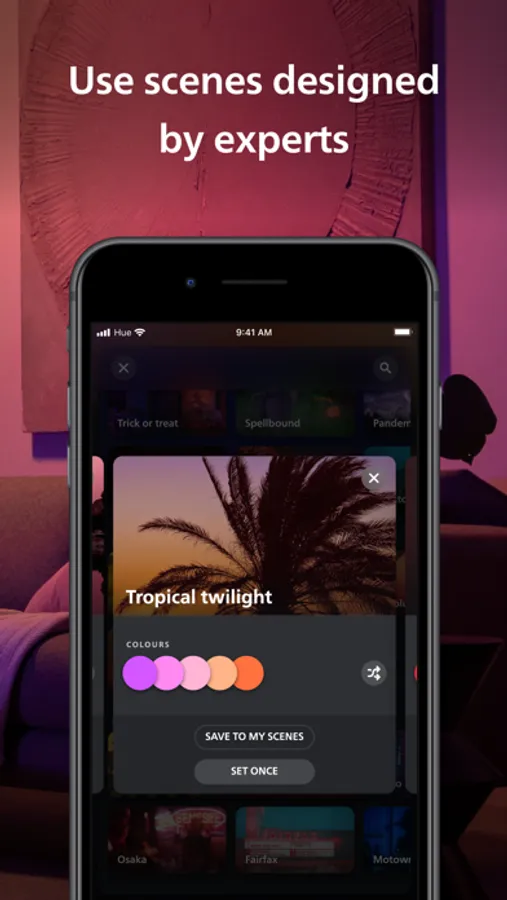 Created by professional lighting designers, scenes transform your room in an instant. Create a unique atmosphere with the Honolulu scene, the vibrant colors of Soho, and more. Browse the Hue scene gallery and tap a scene to set it — or create your own based on a photo or your favorite color palette.