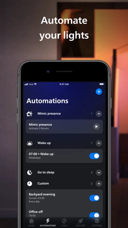 Make your smart lights work around your daily routine. Whether you want your lights to gently wake you up in the morning or greet you when you get home, setting up customizable automations in the Hue app is effortless — and fun!