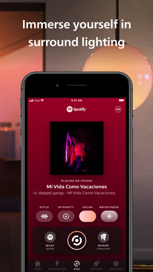 Make your lights flash, dance, dim, brighten, and change color in sync with your screen or sound! Use the Sync tab to sync your lights with the Philips Hue Play HDMI sync box or Spotify.