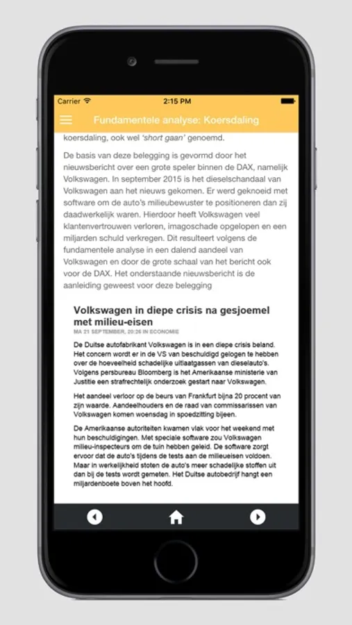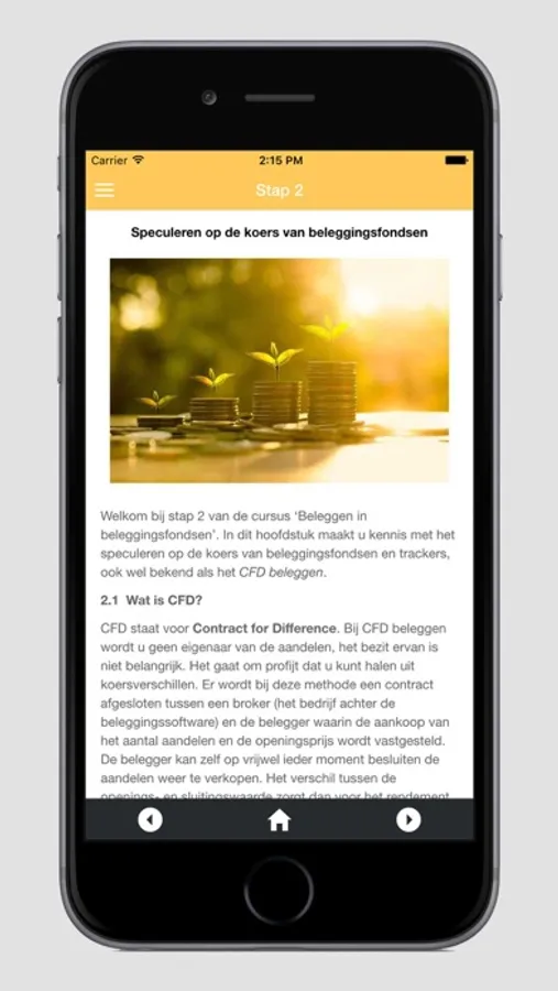 In deze app kunt u lezen over beleggen via Contract For Difference (CFD). Bij deze manier van beleggen wordt er een contract opgesteld tussen een koper en de verkoper. Hierbij wordt afgesproken dat de verkoper het verschil betaalt tussen de openingsprijs en de sluitingsprijs van de aandelen of effecten. CFD is een beleggingsinstrument met een hefboomwerking waarbij u als belegger bij zowel een stijgende als een dalende koers financieel voordeel kunt behalen. De hefboomwerking maakt het beleggen met kleine bedragen aantrekkelijk, doordat men grotere rendementen kan behalen dan bij het traditionele aandelen kopen.