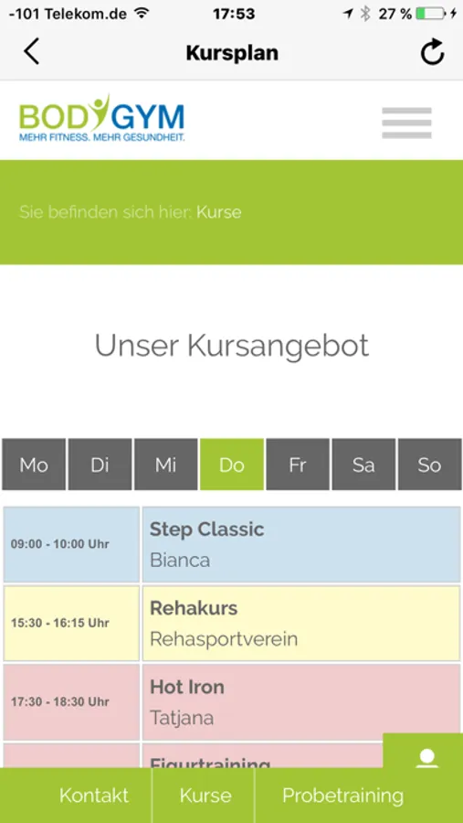 Direkter und aktueller Zugriff auf den Gruppentrainingsplan: Für jeden Kurs können Sie Details wie Zeit, Kursbeschreibung und leitender Trainer einsehen.