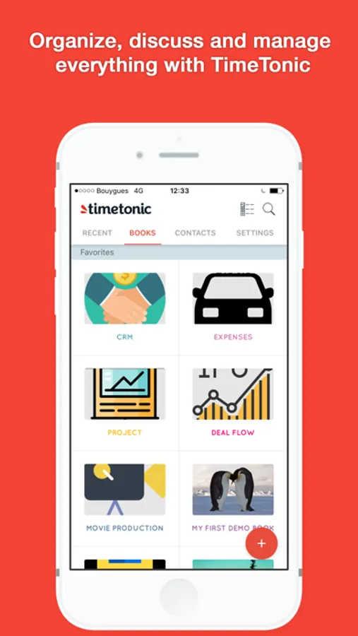 One last thing: every book has its own email address. It's never been easier to stay organized as a team: just cc TimeTonic to make sure everyone is in sync! And you can even text messages directly to your books. Ideal to record that important idea or to 'get rid' of expense reports.