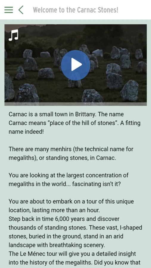 Explore the areas of "le Ménec", "Kermario" and "Kerlescan" that belongs to this unique site. You will travel 6000 years back in time and discover thousands of menhirs. The app proposes a map on which you can localize yourself, audio content and pictures to better apprehend the details of the circuit. For a better user experience, we recommend you to use the app from October to April, when the stones are freely opened to the public.