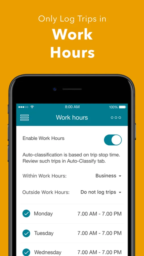 - Only log Business trips when you’re on the clock using MileCatcher’s Work Hours feature