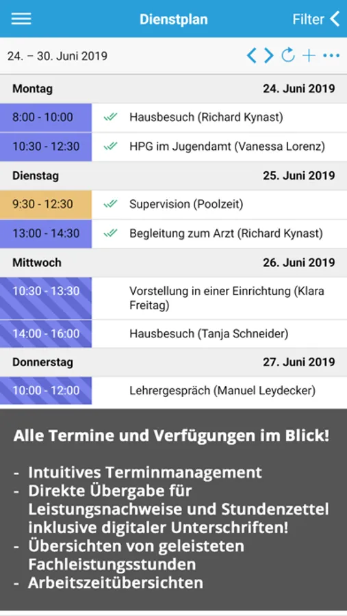 • Echtzeitsynchron - Alle Termine zu den Klient*innen und Gruppen werden zwischen den beteiligten Mitarbeiter*innen geteilt. So hat jeder jederzeit die Übersicht über den gesamten Hilfeverlauf.