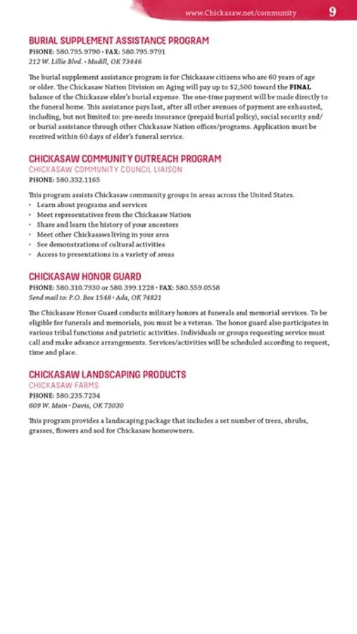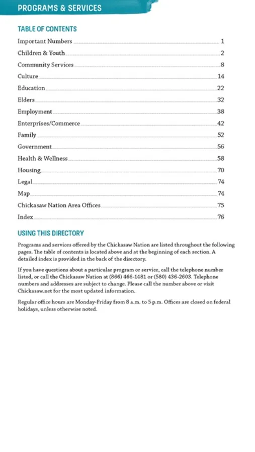 Chokma! The Chickasaw Nation brings you the electronic version of the Programs & Services Directory for Chickasaw citizens at-large (citizens or other Native Americans living outside the Chickasaw Nation boundary).