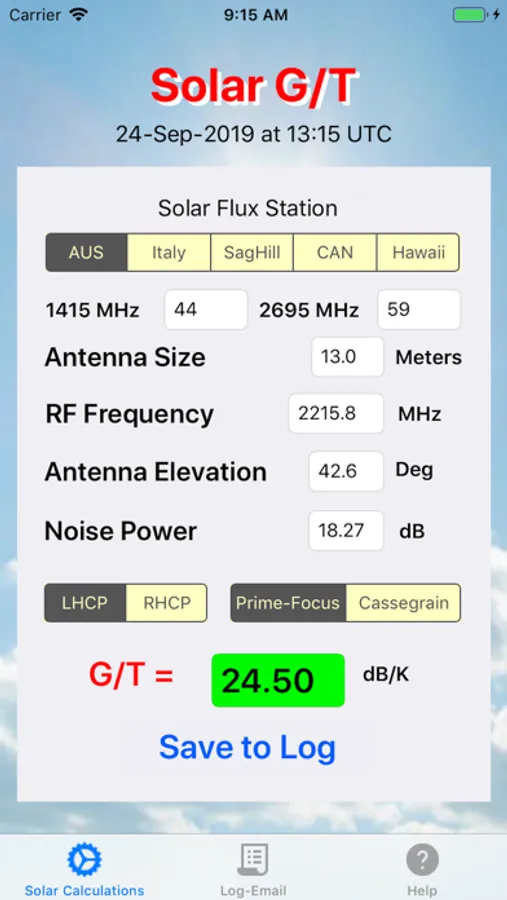 This application provides the ability to compute the performance (aka 'figure of merit') of a parabolic reflector antenna. To use this app you will need to measure the noise produced (dB above cold sky noise) by the Sun at the desired radio frequency. To compute results please enter: Antenna Site location; Antenna ID; Antenna Size; Antenna configuration; Polarization of test; Frequency of test; and Antenna elevation. The application will then go and automatically get the most current solar flux to calculate the results. The application then computes the results and stores multiple result runs in a log that can be emailed to yourself or others.