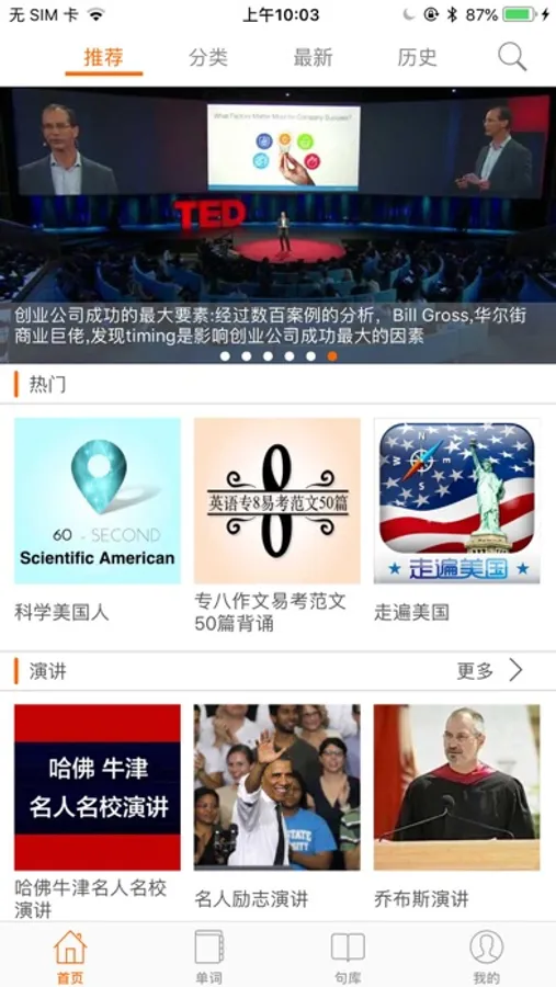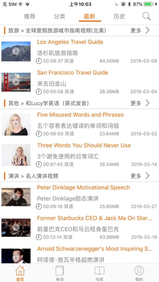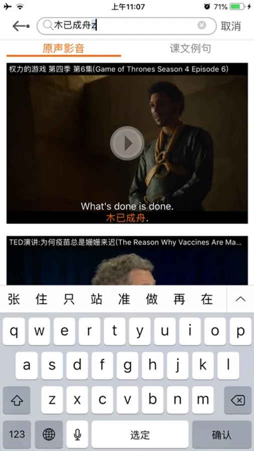 2.句库功能: 海量的原声影视, 课文例句。支持英文,中文简体/模糊搜索/分类搜索。