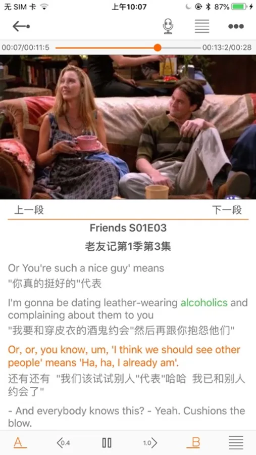 3.任意设置复读区域,进/退精确到0.1秒,便于精确到单词甚至音节的听写,同时也便于辨别自己的发音是否准确。