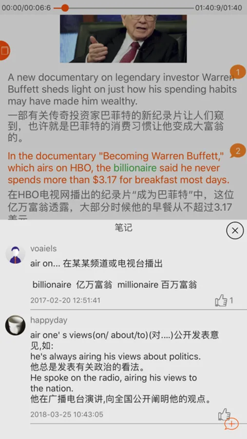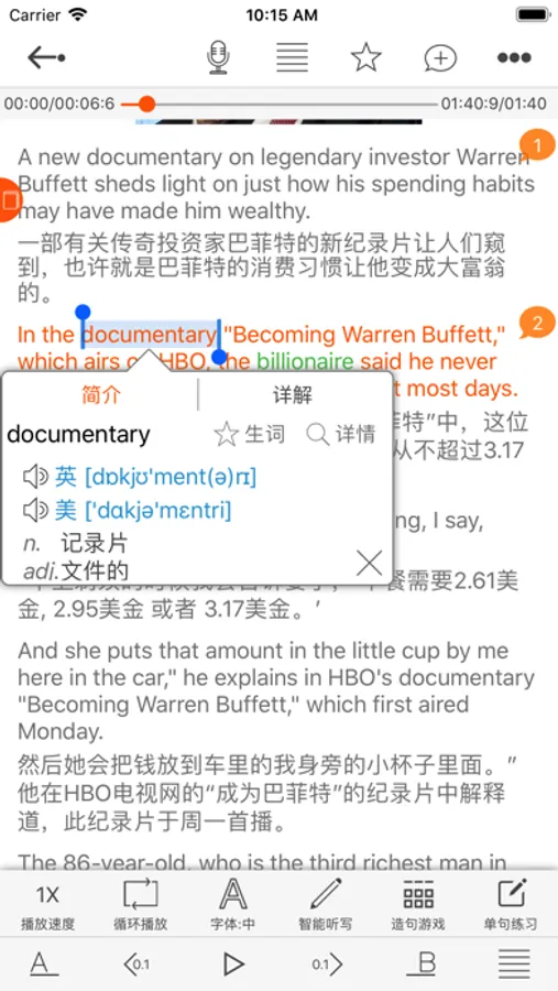 4.2~3种学习模式,听读过程中可以设置是否隐藏中文/英文。 详情模式可以针对某句进行隐藏,便于集中学习某句。全文朗读支持句间停顿。