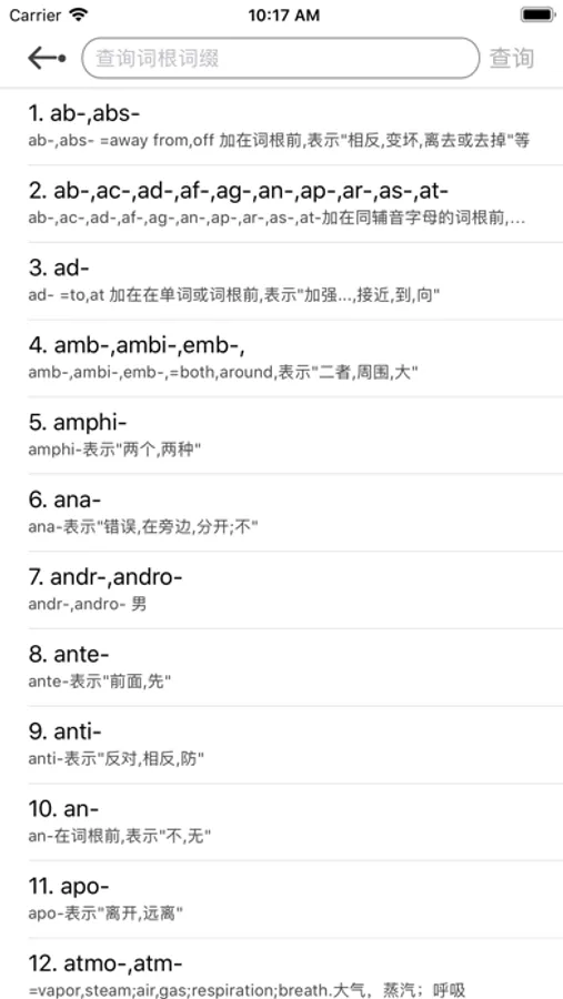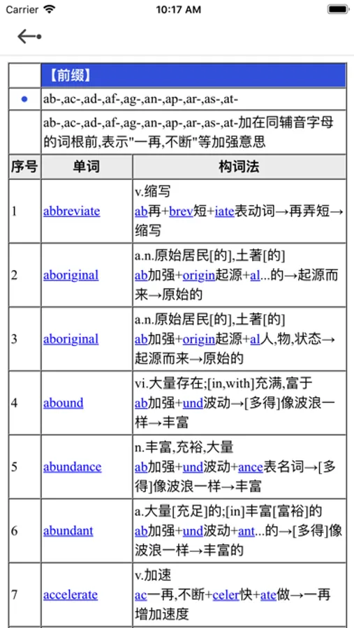 3.词根词缀构词法,词根词缀是非常有效的通过联想方式记忆单词的方法。不同于其他软件和书籍,本软件支持常见词根词缀查询,常见单词构词部分定位查询,通过单词可以快速定位到对应的词缀,通过词缀查到所有相关的单词,大大方便联想记忆。