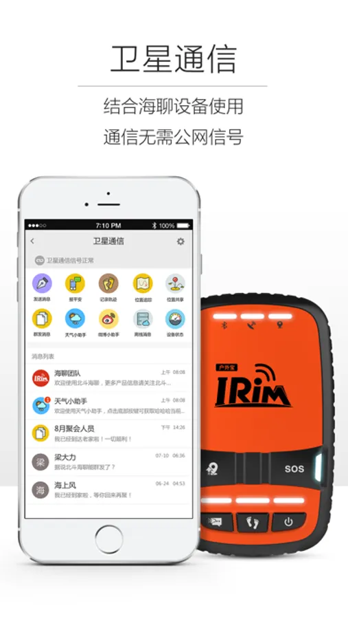 北斗海聊是一款户外卫星通信工具。用户购买或租用海聊设备,通过手机APP蓝牙连接海聊设备,即可发送卫星短信,无需手机信号或网络。卫星短信可发送到家人的微信、手机短信、电子邮件,也可以与其他使用海聊的用户聊天。为户外运动爱好者如驴友,骑行,越野探险等提供有效应急通信手段,保障生命安全。为海上工作者,如海员,渔民和他们的家人提供沟通工具。