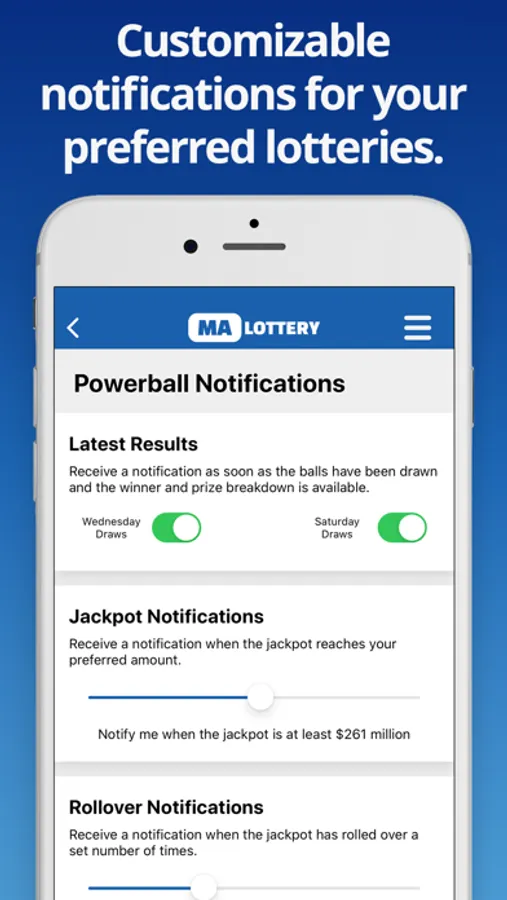 Get notified instantly when the latest lottery results and prize breakdowns become available. The App allows you to customise notifications for specific lottery games and you can also choose which days of the week you play. Want to know when the jackpot has rolled over or has reached a certain amount? Just head to the Notification section of the app to set up your alerts. There is also the option to set notifications at times that suit you - great for reminding you to purchase tickets before the draw.