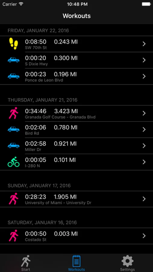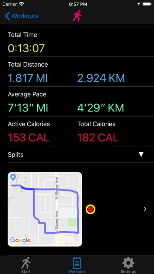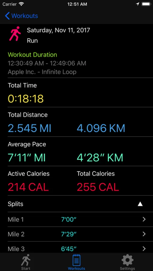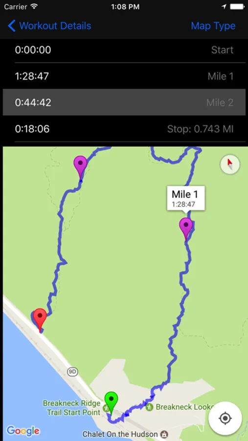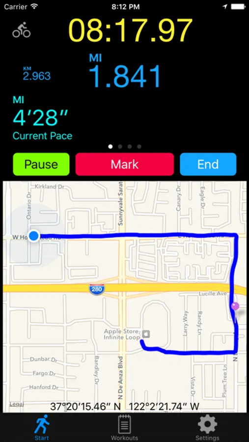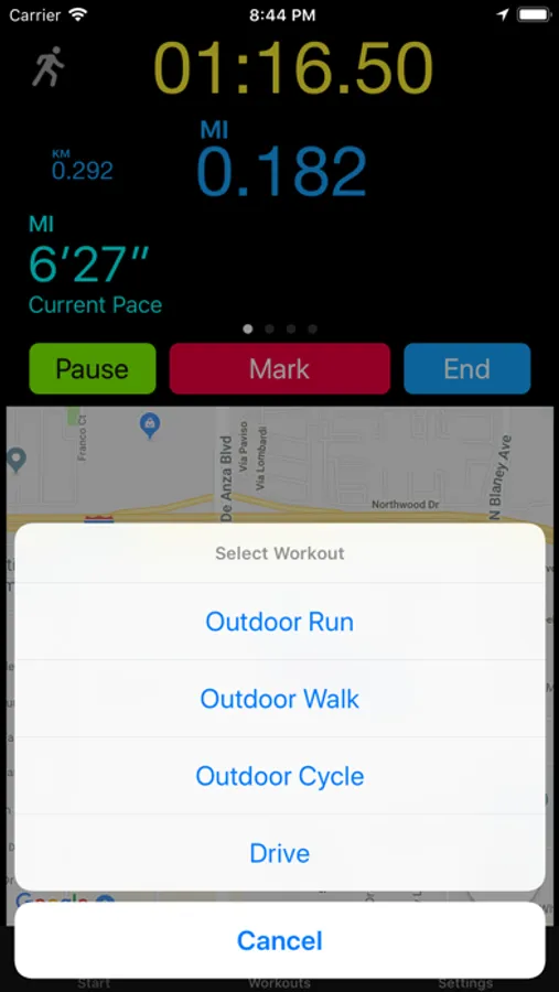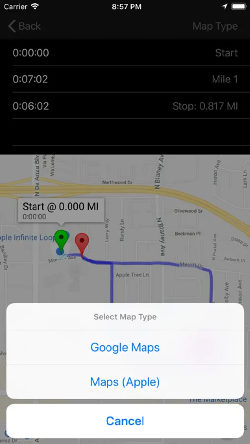 Outdoor Run++ saves a map of the path you have traveled and shows you mile or kilometer markers. You can use the "Mark" button to mark certain locations on your path so that you can check the distance and time it took you to get to that mark.