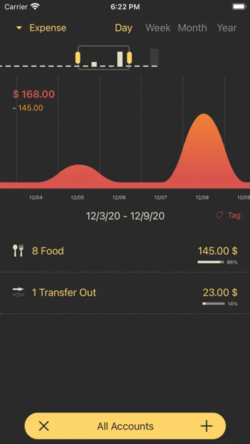 For a long period of time, how can we be clear about the overall balance of payments? We hope that the dynamic trend chart of Costgram can give you this answer. Dynamic trend graph, through the simplest interaction - sliding left and right, you can see the trend of income and expenditure in a continuous time range. In addition to being able to swipe left and right to view trends in different time intervals, you can also use the finger to pull the slider to adjust the current trend's range, so that you can zoom in and out of the range of the trend graph display. Each unit time displayed on the trend graph can be seen after clicking on the detailed data of the selected unit, such as the proportion of each label consumption. After clicking, you can see that each label specifically contains those consumption details. This overview of trends and deeper understanding of the key dates of consumption can be regarded as the best way to master your consumption and life.