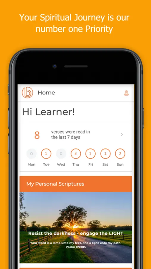 An easy to navigate Home Page that quickly gets you to all the app's main sections: Verses for Me, Tracks & Content, Daily Bible Teaching, and the Forward Daily Devotional.