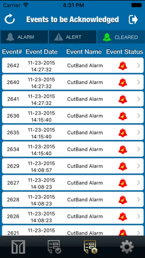 There are three menus on the app that offer three different views of all of the events. The first is all events acknowledged or not. The next will show you only events that have been acknowledged and lastly is the menu that shows you only events that have yet to be acknowledged. Within these menus events will be separated by active alarms, active alerts, and cleared alarms and alerts. When an event is cleared it will automatically move from the “Active” screen to the “Cleared” screen. At any time you can select the event and it will show you all details including who acknowledged it and when.